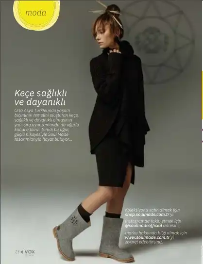 Giyen kişilere farklı alanlarda uğur ve şans getirmesi için işlenmiş olan bu desenler, Soul Made ürünlerine spiritüel bir derinlik, doğal sıkıştırılmış yünün faydaların yanı sıra güzel anlam ve enerjiler katıyor. Soul Made marka konseptini oluşturan, kökeni Orta Asya’ya dayanan ve dünyanın en eski tekstil malzemesi kabul edilen keçe, son derece sağlıklı bir materyal, kolay kolay su ve soğuk geçirmez bir yapıya sahip olan keçe doğal bir malzeme olması, kışın sıcak yazın serin tutması, iyi bir yalıtkan olması sebebiyle oldukça sağlıklı. Radyasyon ışınlarını geçirmiyor ve yapısında bakteri barındırmıyor.